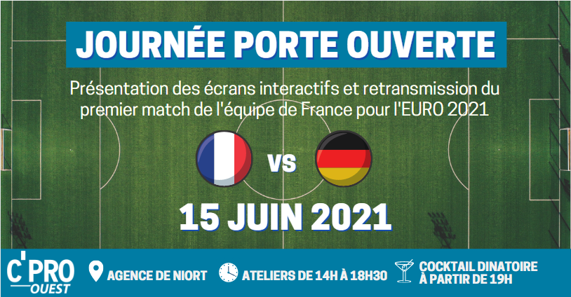 Pour terminer cette journée Porte Ouverte, l’agence de Niort organise un afterwork football à partir de 19h. Le premier match de l’équipe de France, face à l’Allemagne pour l’EURO 2021, sera retransmis en live sur nos écrans F&VL ! Un cocktail dinatoire accompagnera cette soirée.